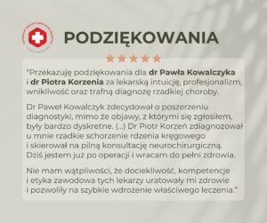 przekazuję podziękowania dla dr Pawła Kowalczyka (Poradnia Neurologiczna) i dr Piotra Korzenia (Pracownia Rezonansu Magnetycznego) za lekarską intuicję, profesjonalizm, wnikliwość oraz ostatecznie za trafną diagnozę rzadkiej choroby.Dr Paweł Kowalczyk zdecydował o poszerzeniu diagnostyki, pomimo, że objawy, z którymi się zgłosiłem były bardzo dyskretne i paradoksalnie niewzbudzające we mnie obaw co do stanu mojego zdrowia.