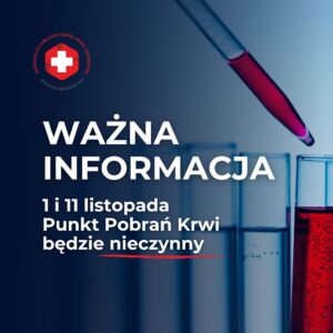 Drodzy Pacjenci, uprzejmie informujemy, że Punkt Pobrań Krwi przy wejściu głównym Szpitala Powiatowego (ul. Szpitalna 37, budynek C) będzie nieczynny w dniach: