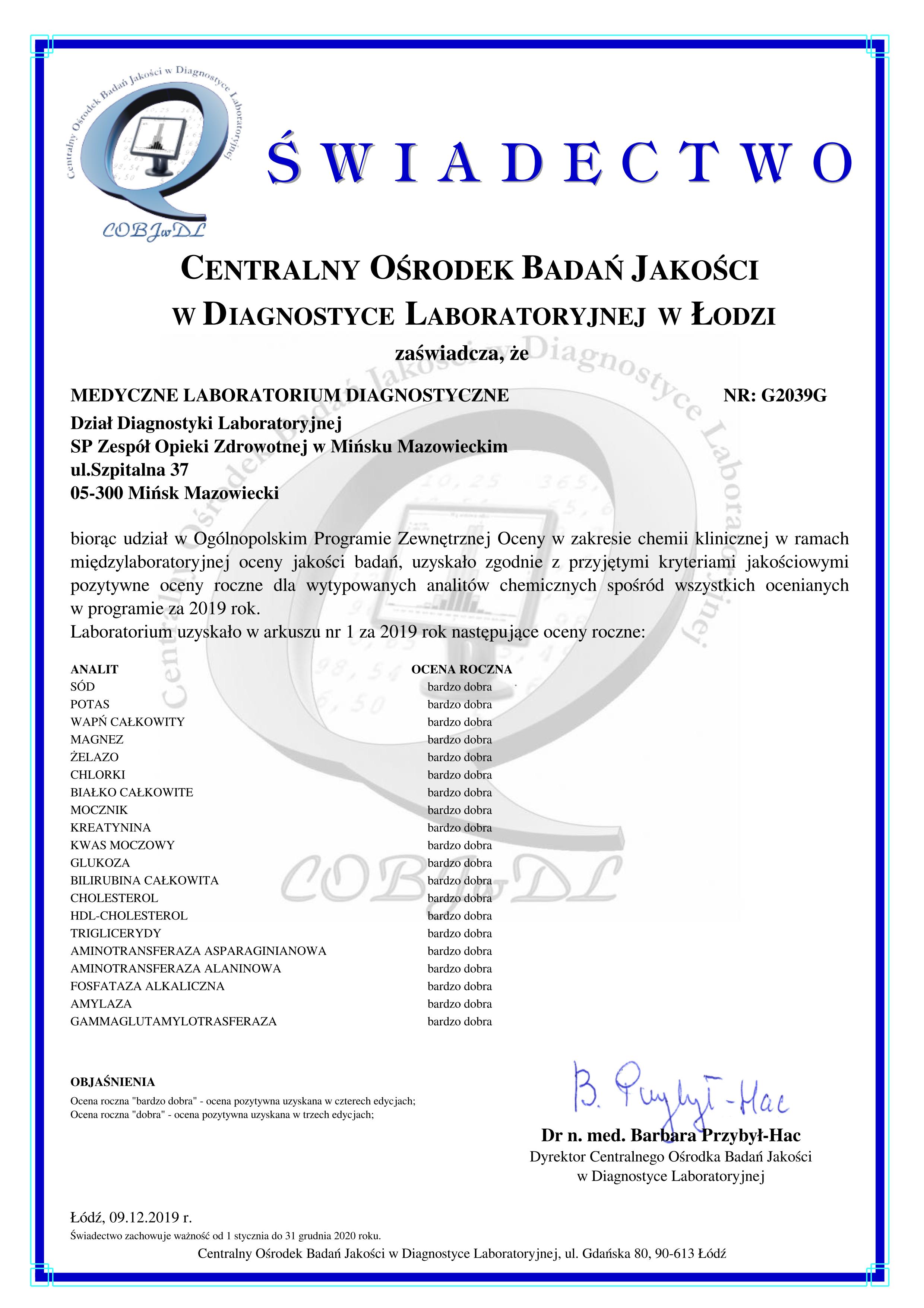 Mamy przyjemność poinformować, że Dział Diagnostyki Laboratoryjnej Samodzielnego Publicznego Zespołu Opieki Zdrowotnej w Mińsku Mazowieckim otrzymał Świadectwo Centralnego Ośrodka Badań Jakości w Diagnostyce Laboratoryjnej za rok 2019 w zakresie chemii klinicznej w ramach międzylaboratoryjnej oceny jakości badań. Uzyskane Świadectwo jest potwierdzeniem staranności nad prowadzonymi wynikami badań laboratoryjnymi w naszej pracowni.