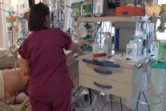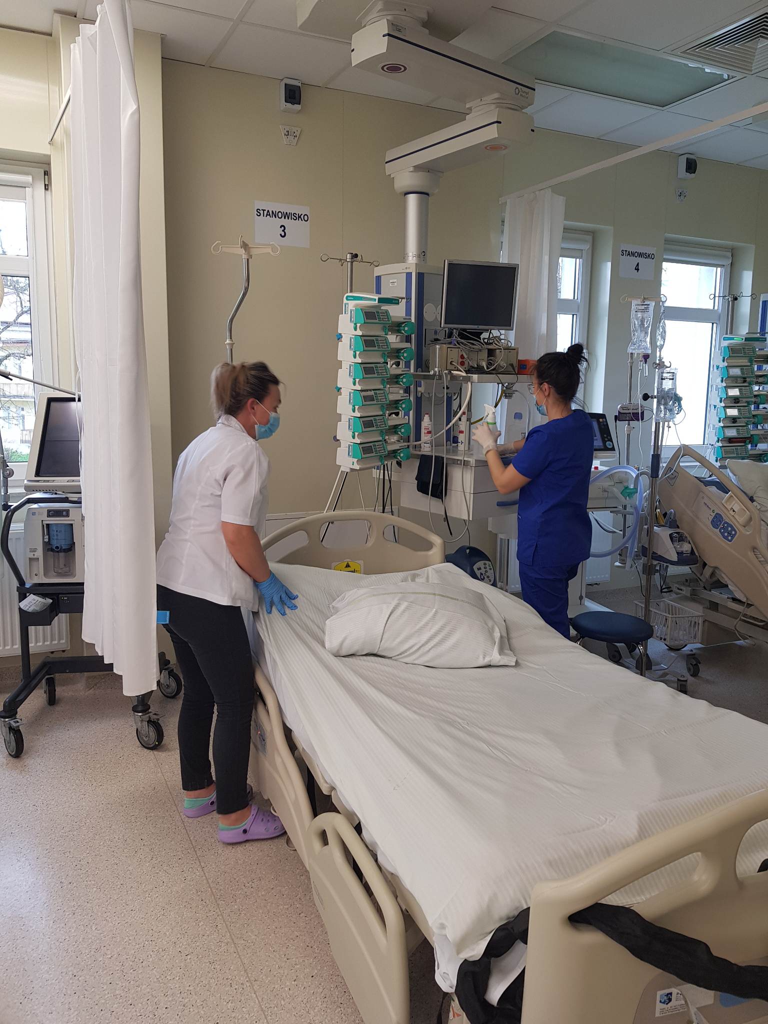 Dyżurujemy w systemie 12-godzinnym. Dzisiaj mam zmianę dzienną, zaczynam od 8 i skończę ją o 20, razem ze mną są jeszcze dwie pielęgniarki. Zwykle wszystkie łóżka są zajęte, dzisiaj na izolatce leży pacjent wymagający od nas stosowania dodatkowych procedur epidemiologicznych, jedna z nas będzie opiekowała się tylko nim. Staramy się zachować taki podział przez całą zmianę ze względu na ryzyko zakażenia i przenoszenia drobnoustrojów, które może wystąpić pomimo zakładanych przez nas ubrań ochronnych, maseczek i rękawiczek. W zaistniałej sytuacji będziemy dzisiaj we dwie zajmowały się pięcioma pacjentami leżącymi na dużej sali. Oczywiście podział pielęgniarek na chorych jest umowny, bo prawda jest taka, że przy nieprzytomnym pacjencie jedna osoba jest w stanie zrobić niewiele, więc pomagamy sobie wzajemnie. Bardzo ważna jest dla nas praca zespołowa. Również relacje z kadrą lekarską układają się bardzo dobrze, współpracujemy ze sobą przy opiece nad pacjentami. Z całą pewnością mogą nazwać nas zgranym zespołem terapeutycznym.